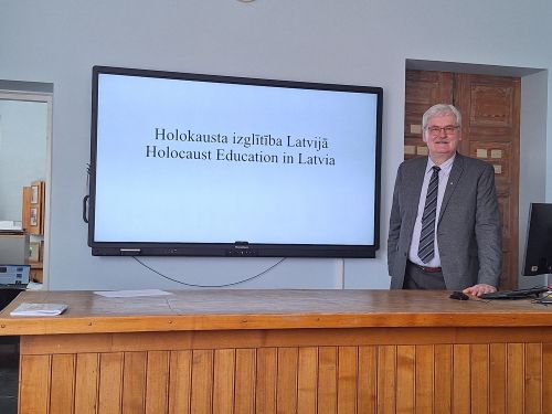 Vācu kolēģi iepazinās arī ar ģimnāzijas muzeja ekspozīciju un pārrunāja abu skolu audzēkņu iesaisti Erasmus+ projektā, lai izpētītu un analizētu traģiskos notikumus Latvijas un Vācijas vēsturē Otrā pasaules kara laikā. M.Zvaigzne iepazīstināja viesus ar prezentāciju "Holocaust Education in Latvia", kā arī nodeva viņu rīcībā kopsavilkumu "Six Versions of the Holocaust in Latvia" no izcilā latviešu vēsturnieka, holokausta vēstures pētnieka Andrieva Ezegaiļa grāmatas "Holokausts vācu okupētajā Latvijā 1941—1944". Sarunās noskaidrojās, ka Biķernieku mežā 1941.-1942.gadā tika nošautas vairākas ģimenes no Floto. Jāatzīmē, ka LU Jūdaikas studiju centra izveidotā karte "Holokausta piemiņas vietas Latvijā" noderēja, lai izstrādātu precīzu ekskursijas maršrutu ar audzēkņu piedalīšanos aprīļa beigās.