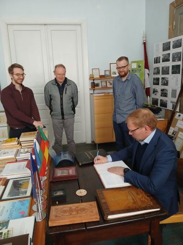 26.martā ģimnāzijas direktore Gundega Muceniece sveica mūsu skolā Floto Vēzeras ģimnāzijas direktoru un 2 kolēģus, kuri bija ieradušies Erasmus+ projekta ietvaros sagatavošanas vizītē, lai pārrunātu turpmākās sadarbības iespējas un plānotu projekta aktivitātes skolēniem kopā ar mūsu pedagogiem - angļu valodas skolotāju Uģi Urtānu, vēstures skolotāju Māri Zvaigzni un Erasmus+ koordinatori Inu Baumani.