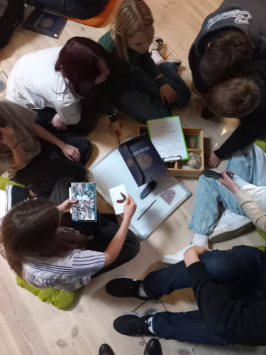 Nodarbības sākumā vadītāja iepazīstināja mūs ar aizvēstures posmiem Latvijā, stāstot un demonstrējot īsus video sižetus par katru no tiem. Pēc tam strādājām trīs grupās, un katrai grupai bija jāizpēta kāds noteikts laikmets — Akmens, Agro metālu (bronzas) vai Dzelzs laikmets.
