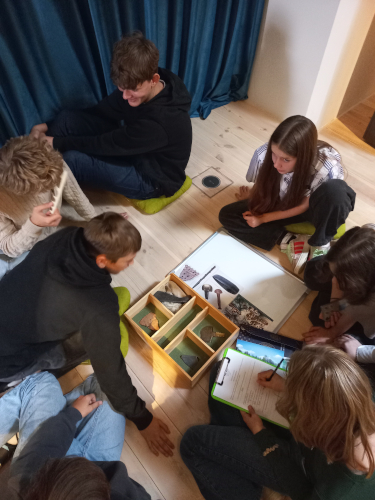 Katrai grupai tika izsniegtas kastes ar darbarīku un ieroču rekonstrukcijām. Mūsu uzdevums bija noteikt, kuri priekšmeti pieder mūsu laikmetam. Papildus saņēmām arī darba lapas ar jautājumiem, uz kuriem bija jāatbild, atpazīstot attiecīgajam laikmetam raksturīgos priekšmetus un daloties ar secinājumiem ar pārējiem klasesbiedriem.